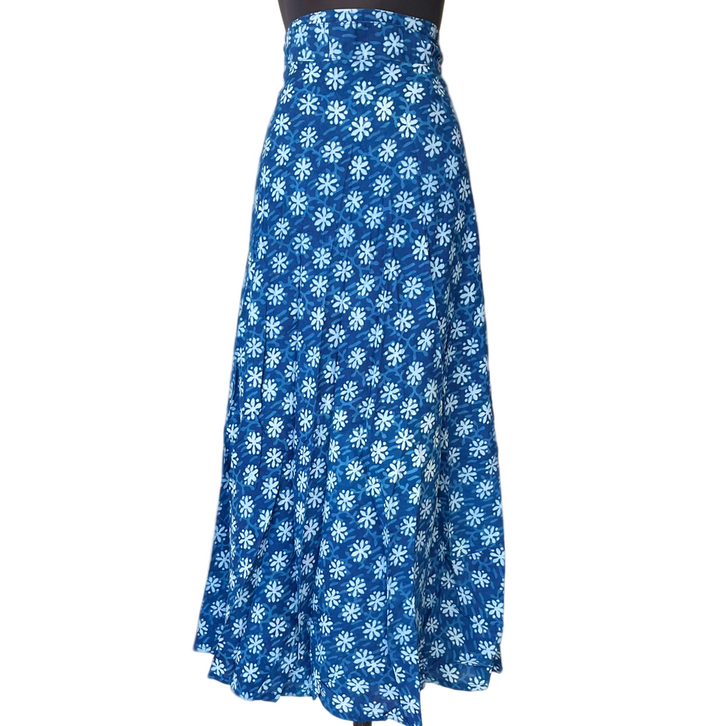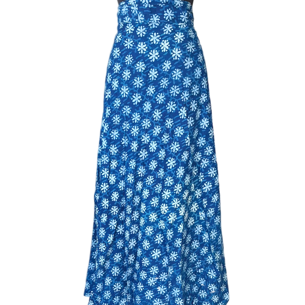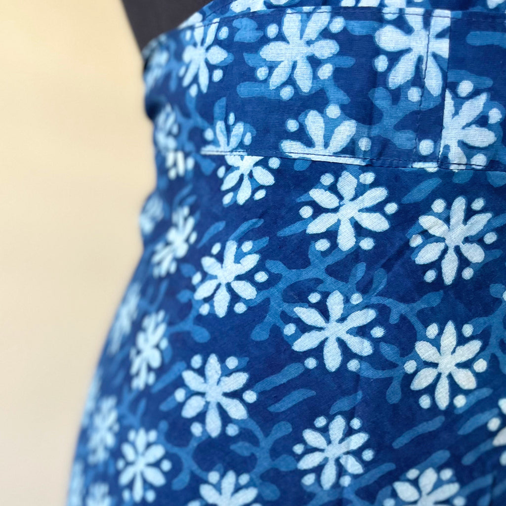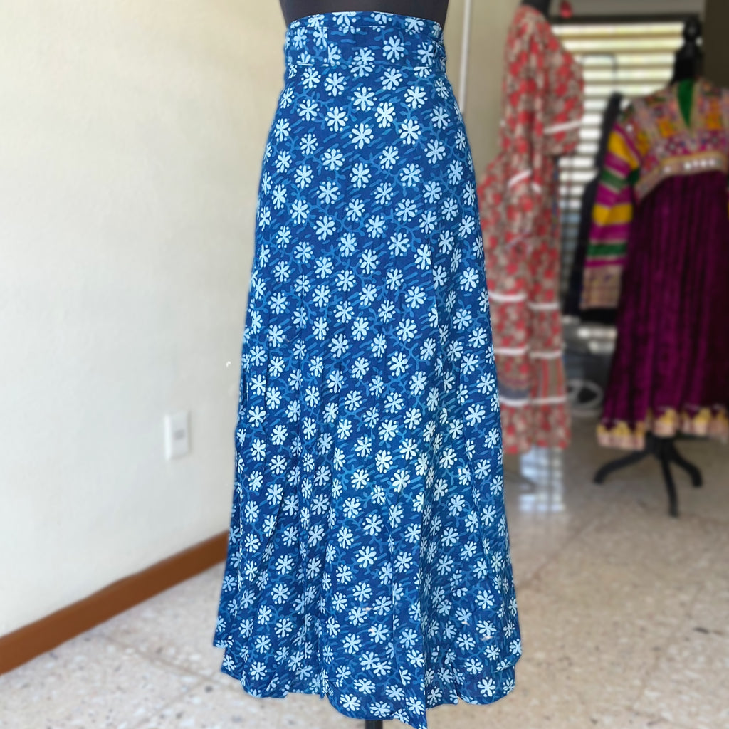 Descripción: Falda envolvente, teñida artesanalmente con una técnica antigua del “block-print” sobre tela de 100% Algodón.