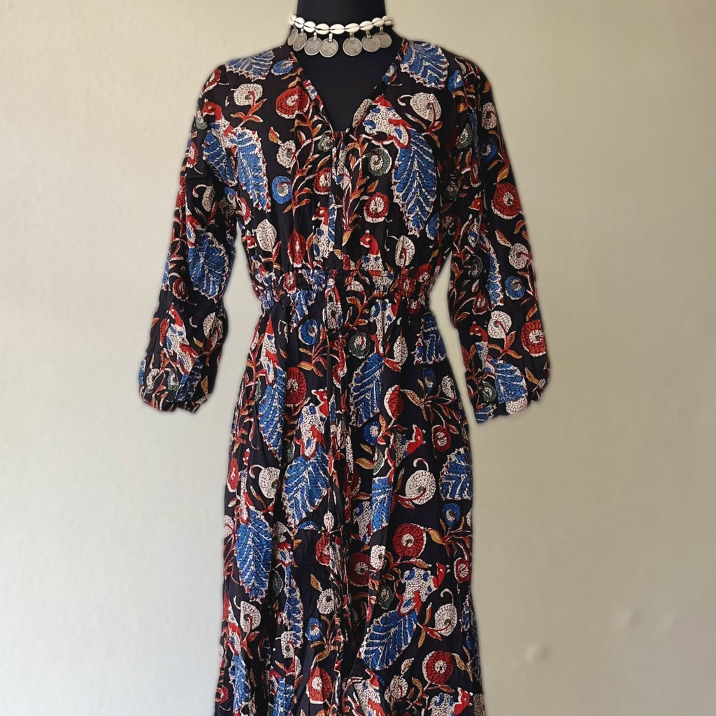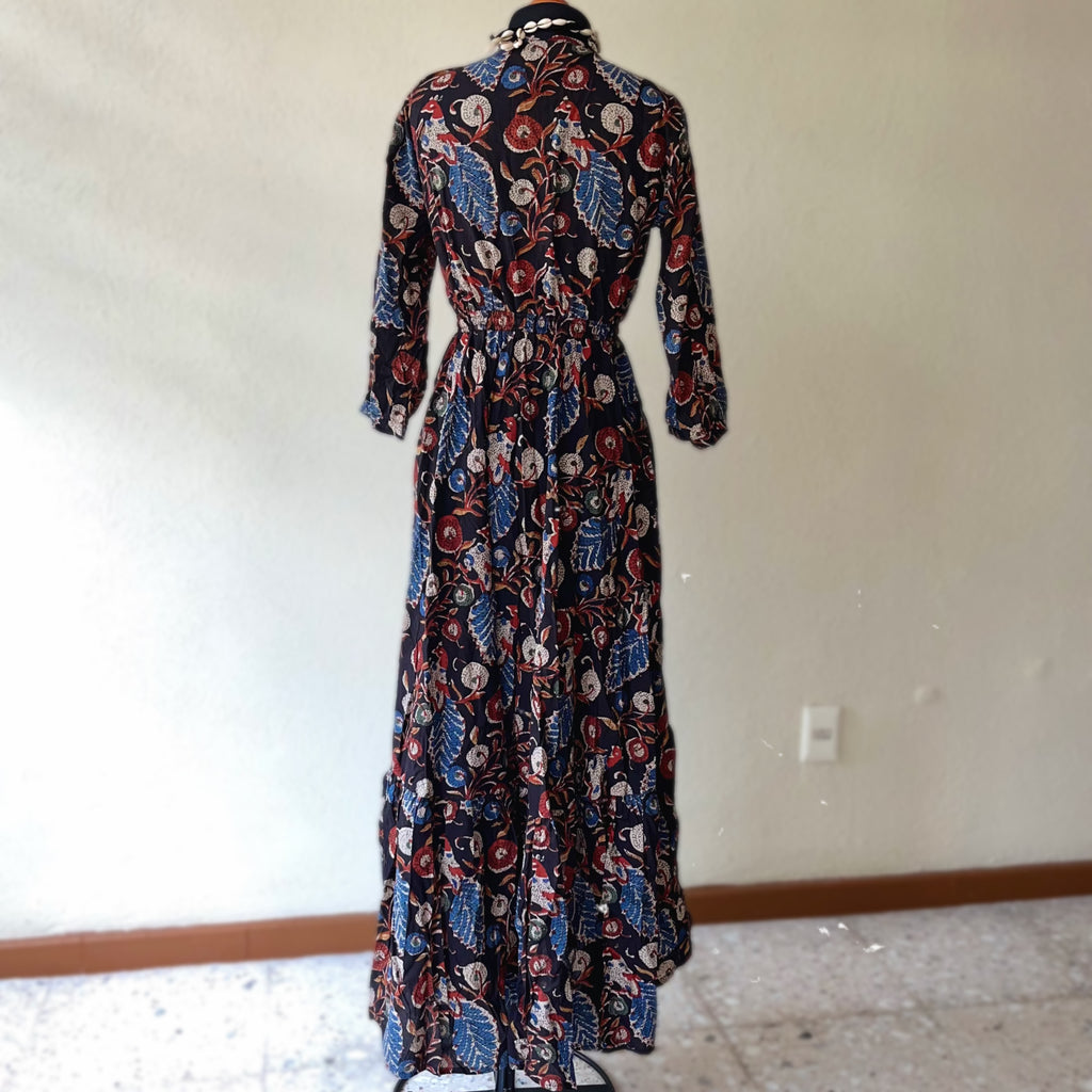 Descripción: Vestido boho teñida artesanalmente con una técnica antigua del “block-print” sobre tela de 100% Algodón.