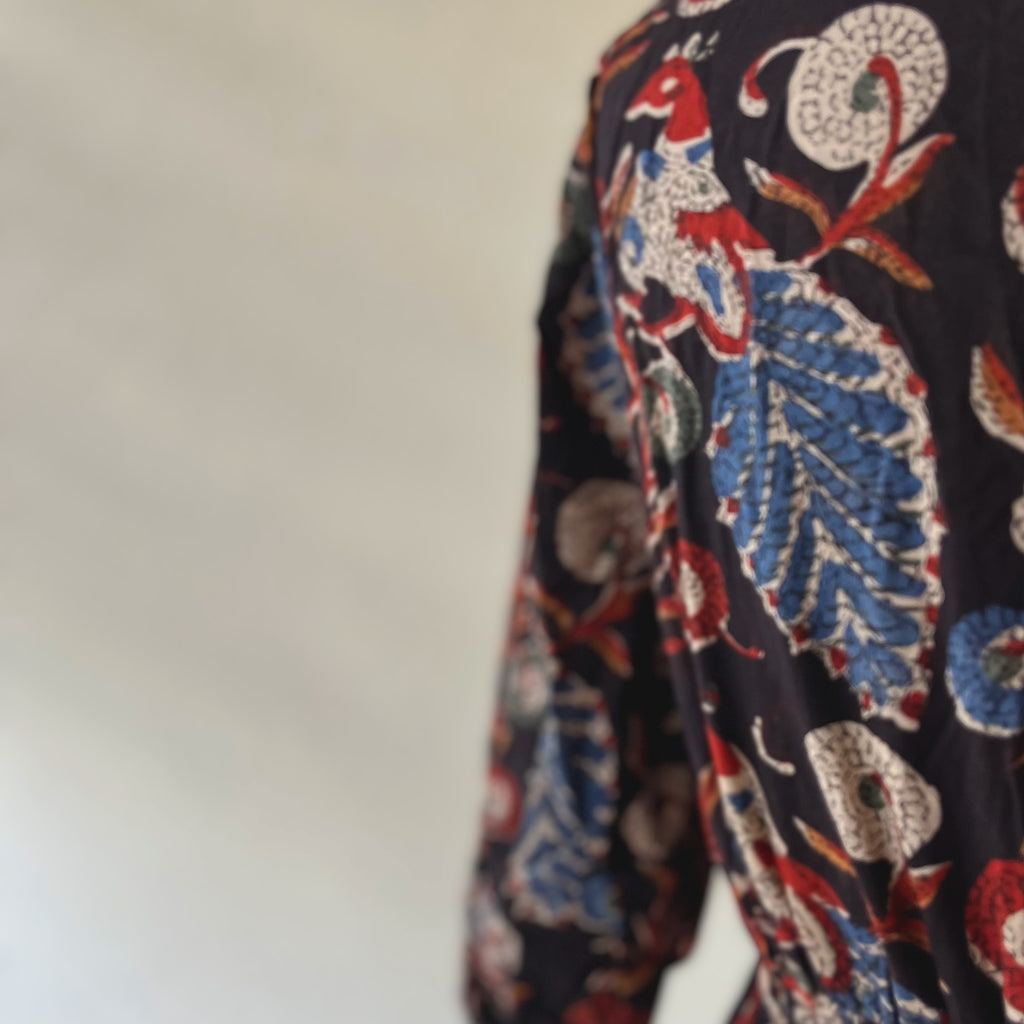 • Materiales: Tela con fibras 100% de algodón. La tela está teñida artesanalmente y sus dibujos están pintados a mano con sellos de madera que, también están diseñados y tallados a mano. Se colocan con tintas sobre la tela para que se transfiera el dibujo.