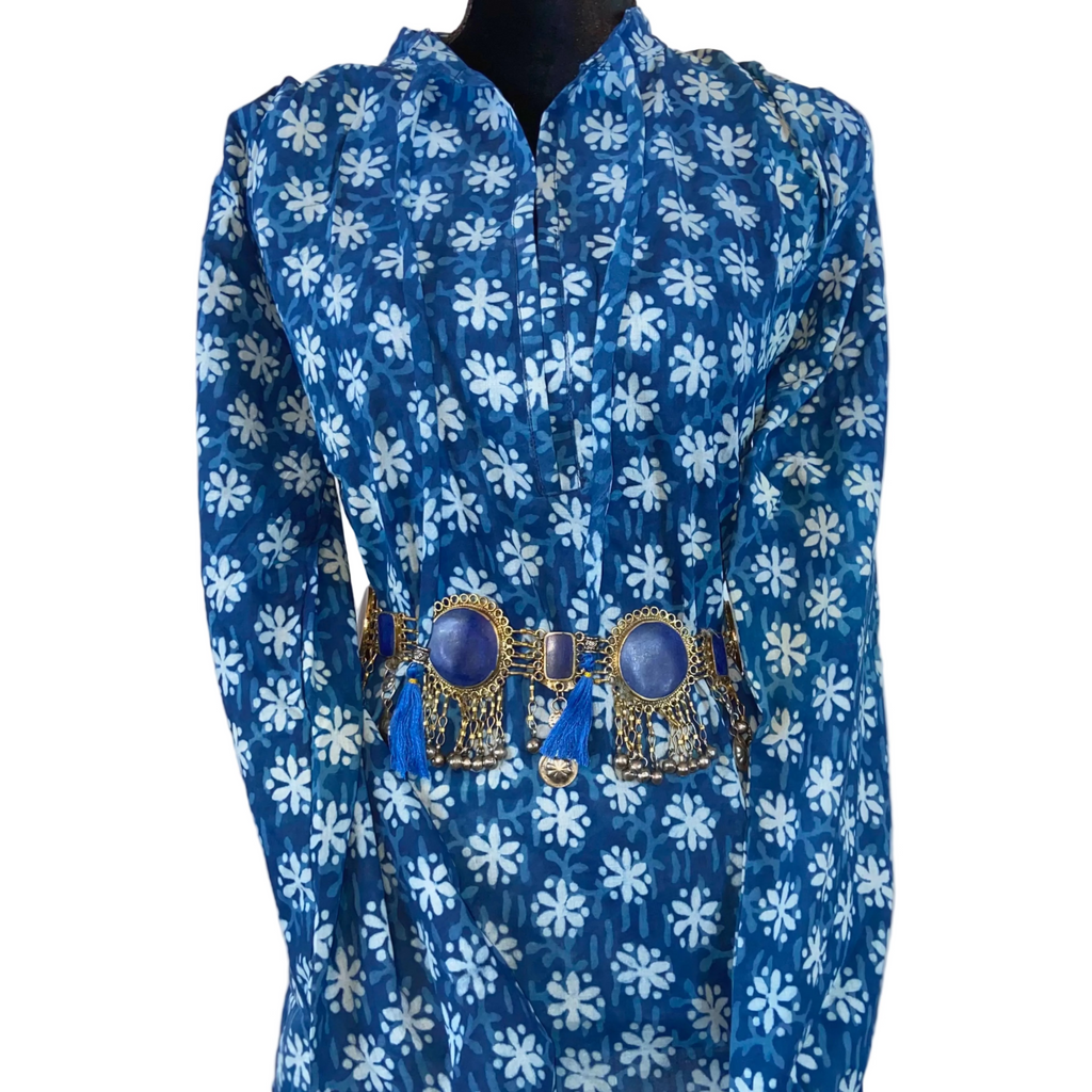 Descripción: Blusa teñida artesanalmente con una técnica antigua del “block-print” sobre tela de 100% Algodón.