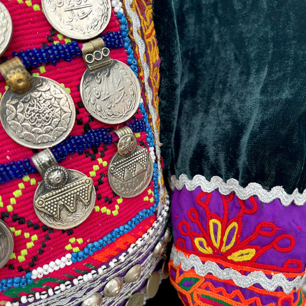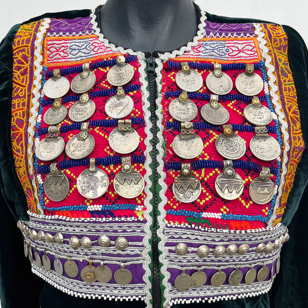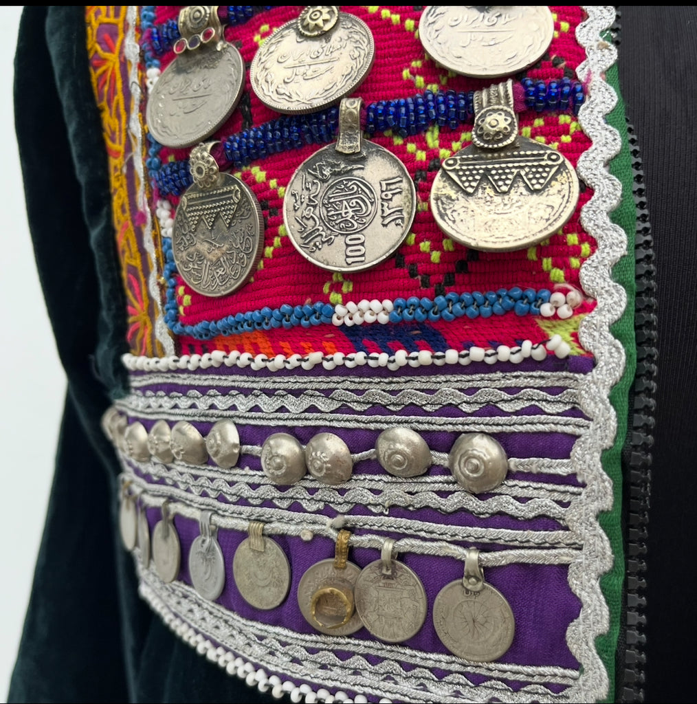 • Esta chamarra es una pieza de colección, esta hecha con bordados tradicionales, monedas y piezas antiguas sobre terciopelo de buena calidad.