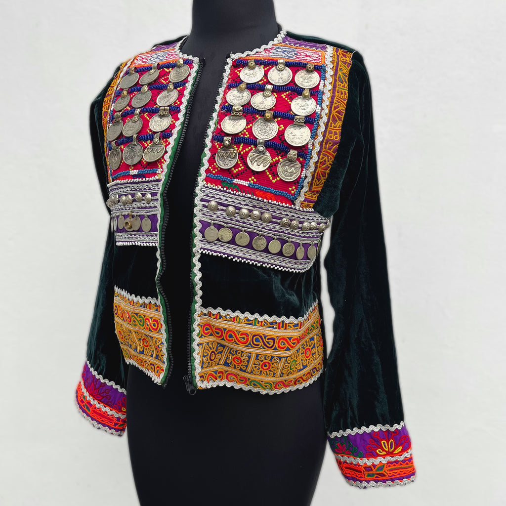• Descripción: Chamarra gitana, hecha con amor de forma artesanal por miembros de la tribu nómada kuchi de Pakistán y Afganistán, en colaboración justa y sustentable con nosotros.