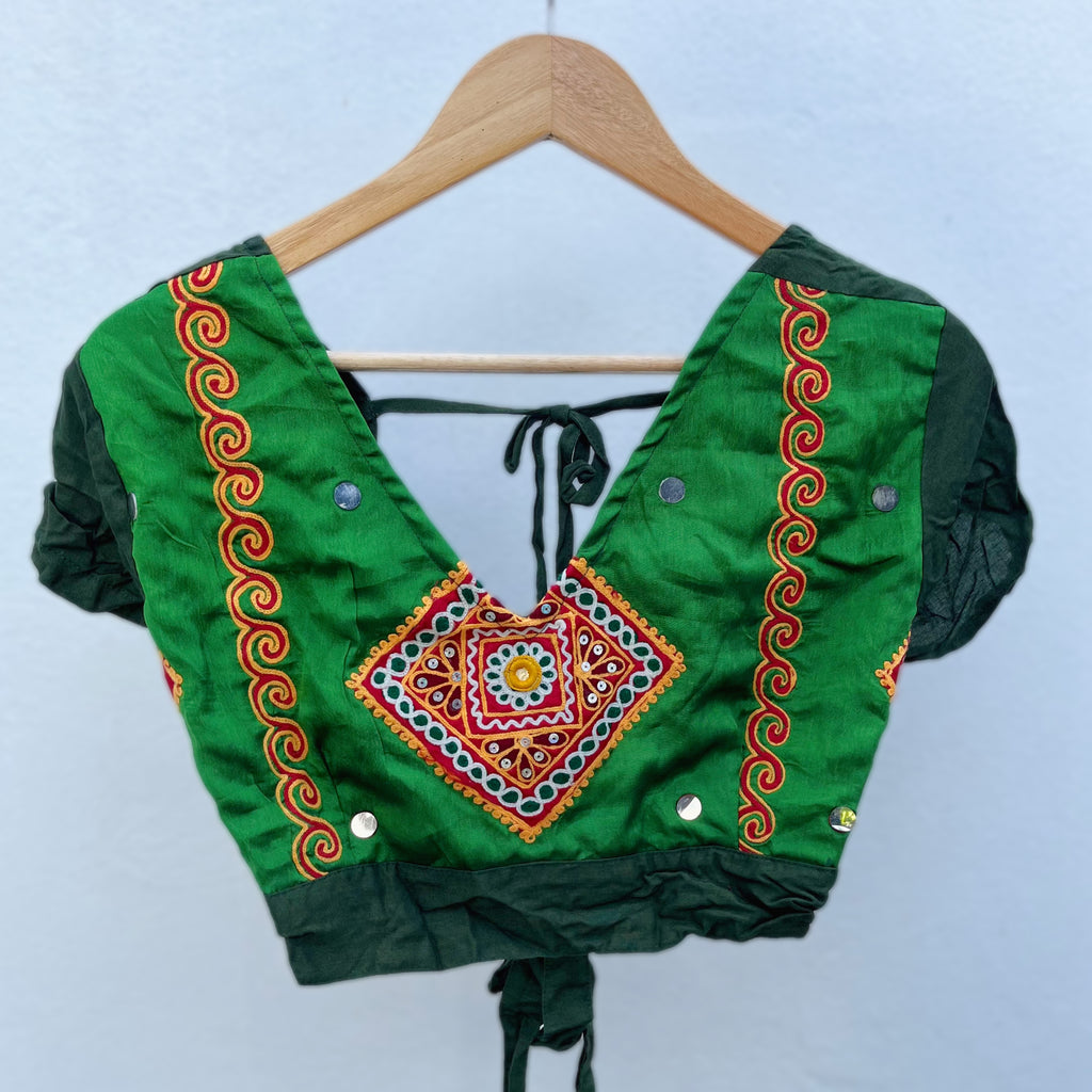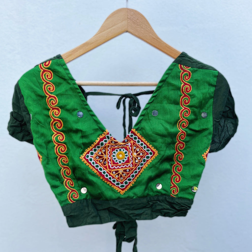 • Descripción: Top o blusa, llamada en su país de origen: Choli. Está hecha con amor por la tribu nómada Banjara de Asía, con bordados tradicionales propios, en colaboración con nuestro pequeño taller ubicado en la India. Este hermoso Choli está cubierto de bordados mágicos por el frente, y por atrás la espalda es descubierta con 2 pares de listones con los que se puede ajustar a la medida.