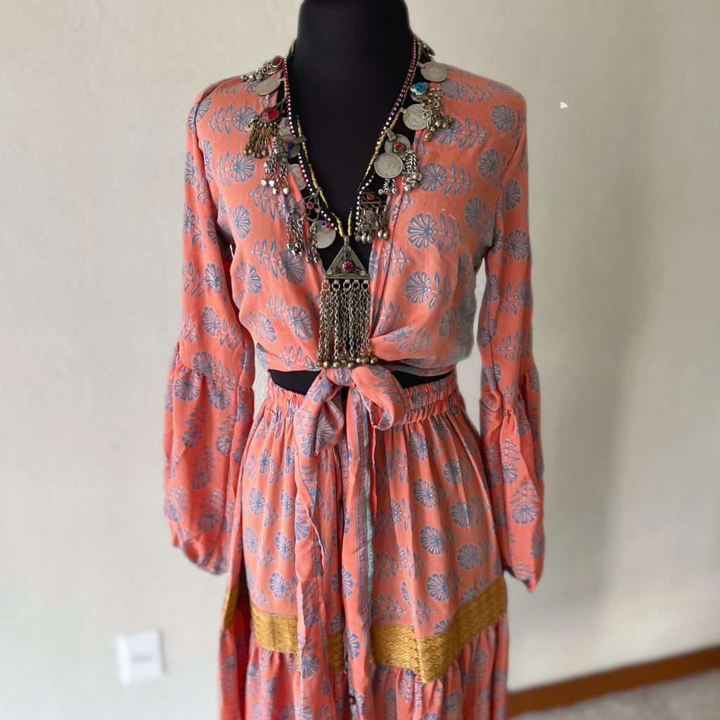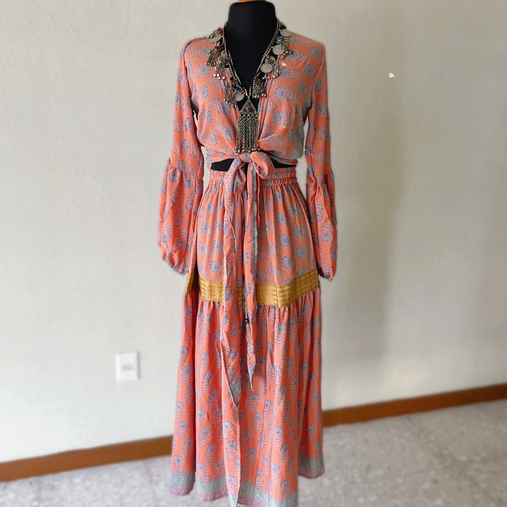 • Descripción: Set Bohemio hecho con “Sedas Deliciosas” y un estilo hermoso, la blusa tiene doble uso y también tiene resorte en la cintura para ajustar.