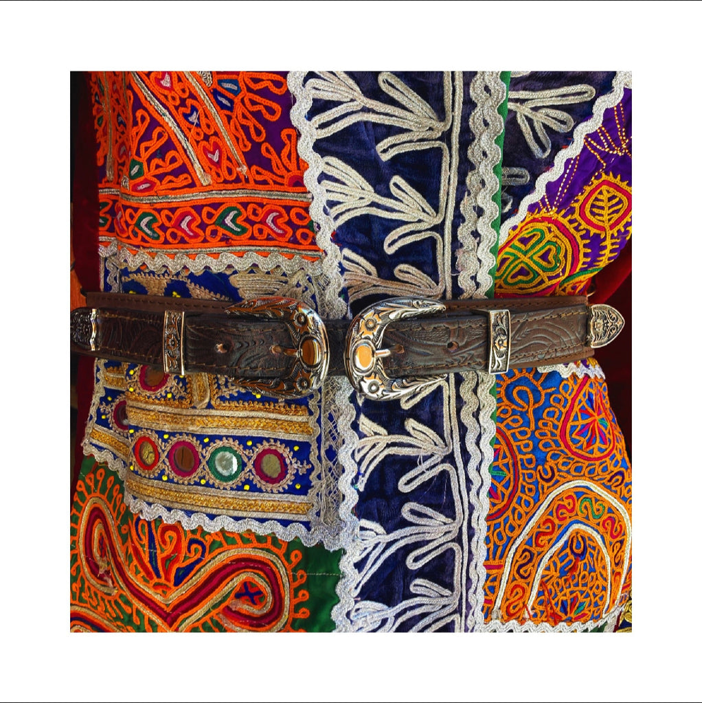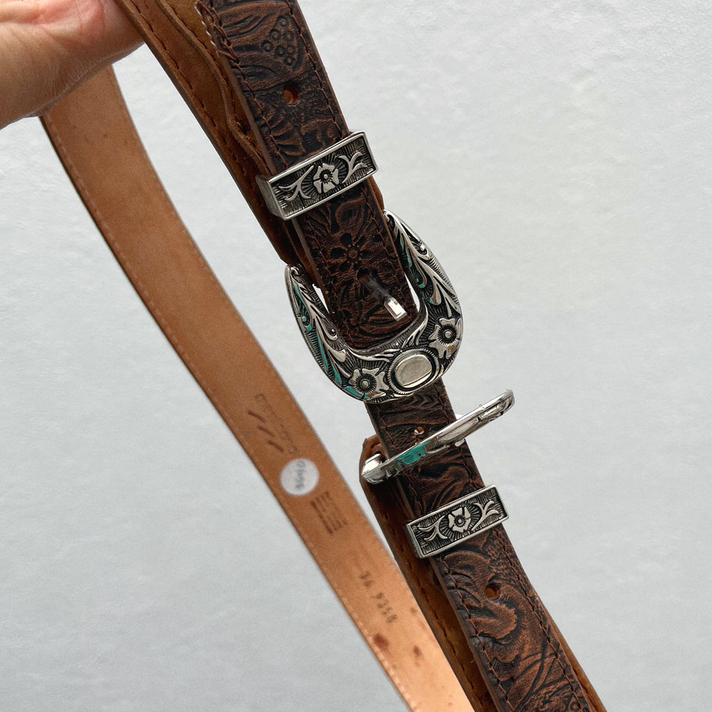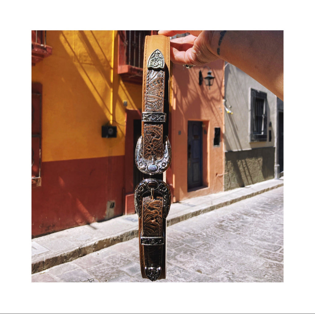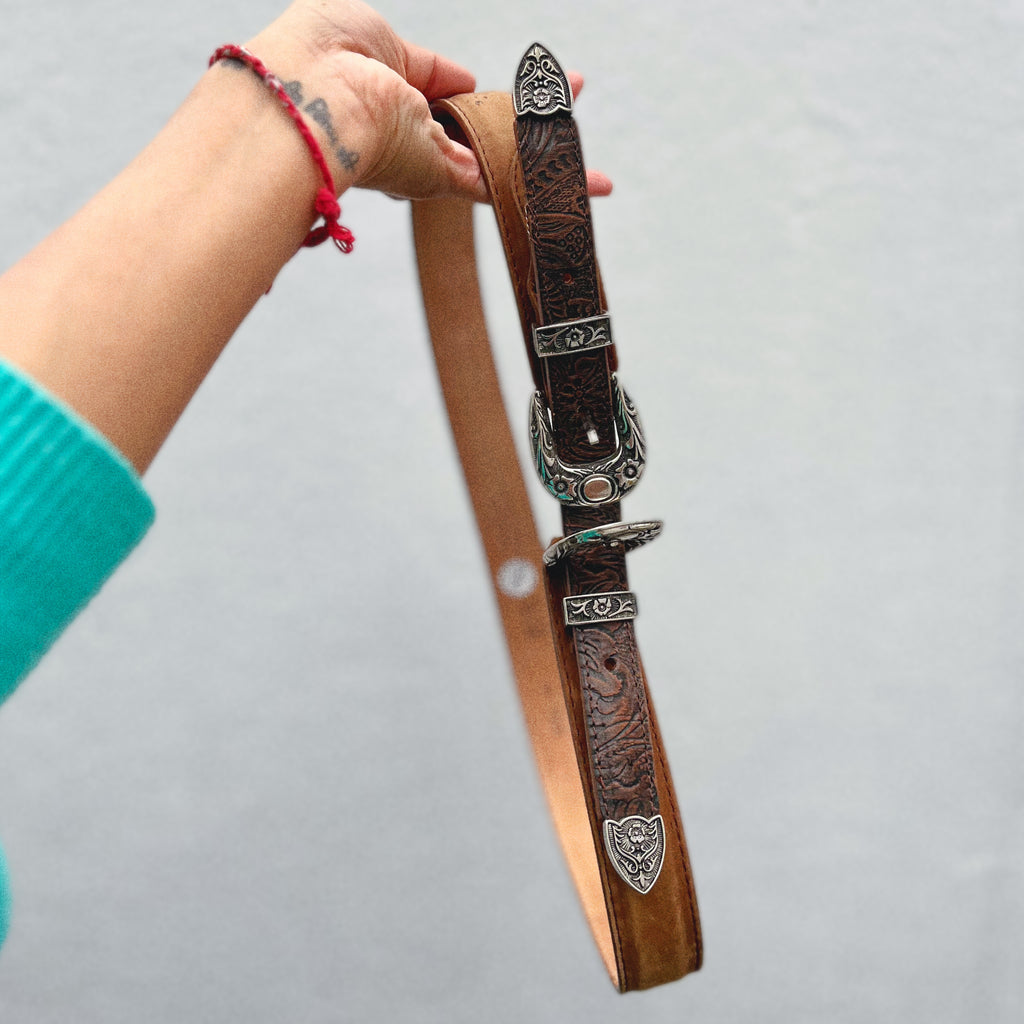 Descripción: Cinturón bohemio de piel, con doble hebilla. Hecho en México.
