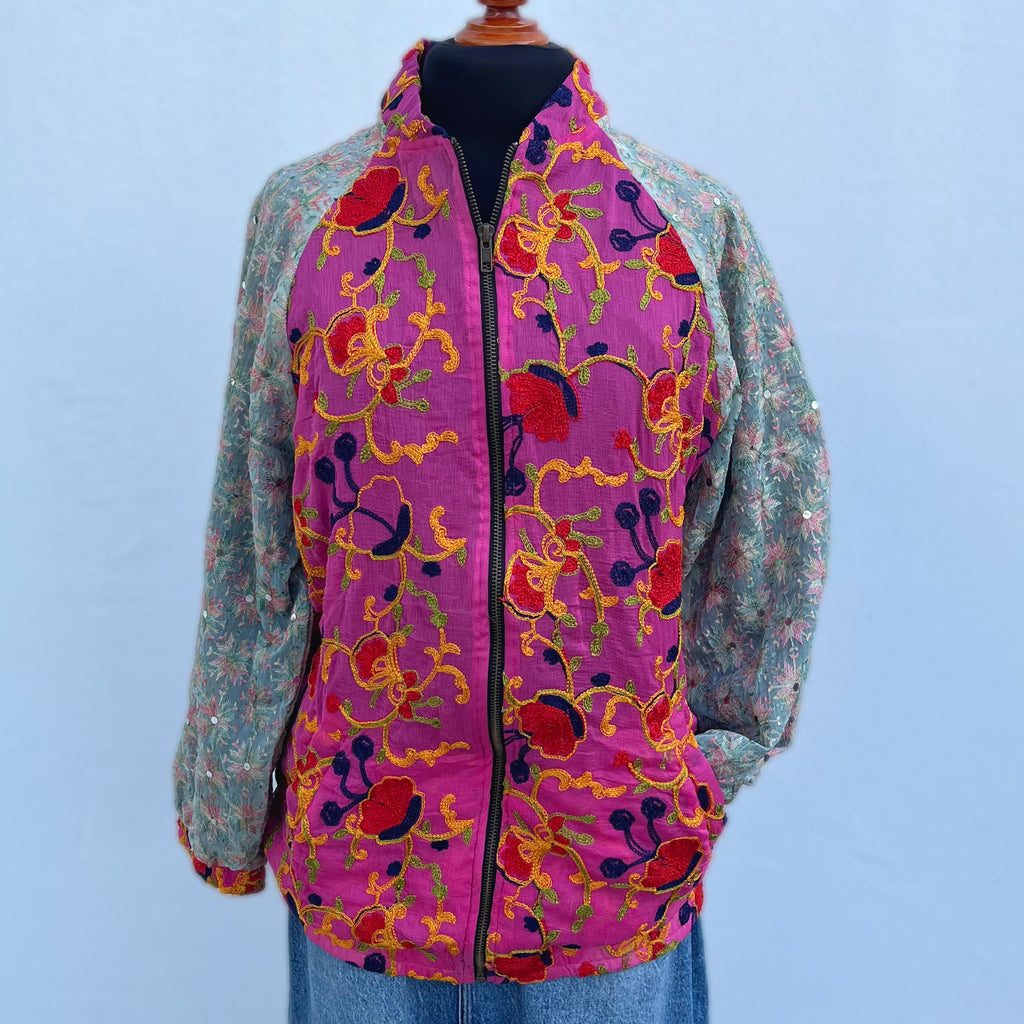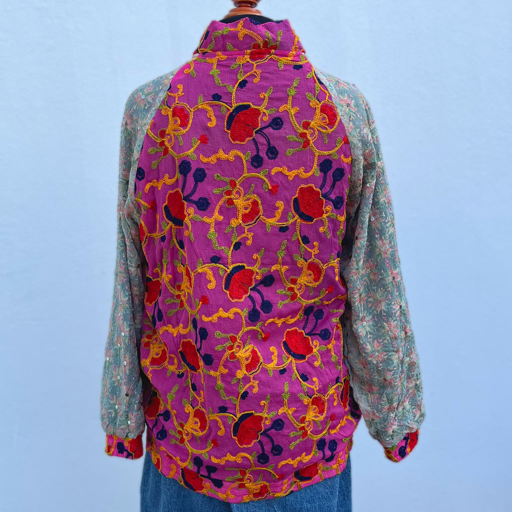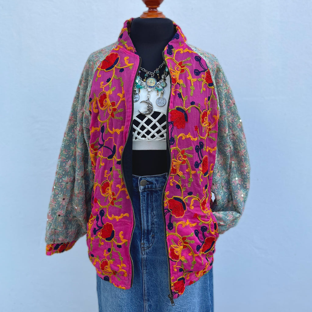 • Descripción: Chamarra mágica, estilo bohemio. Está hecha con amor, con telas de dupattas bordadas y tradicionales, propias de comunidades tribales de Asia, en colaboración justa y ética con nosotros.