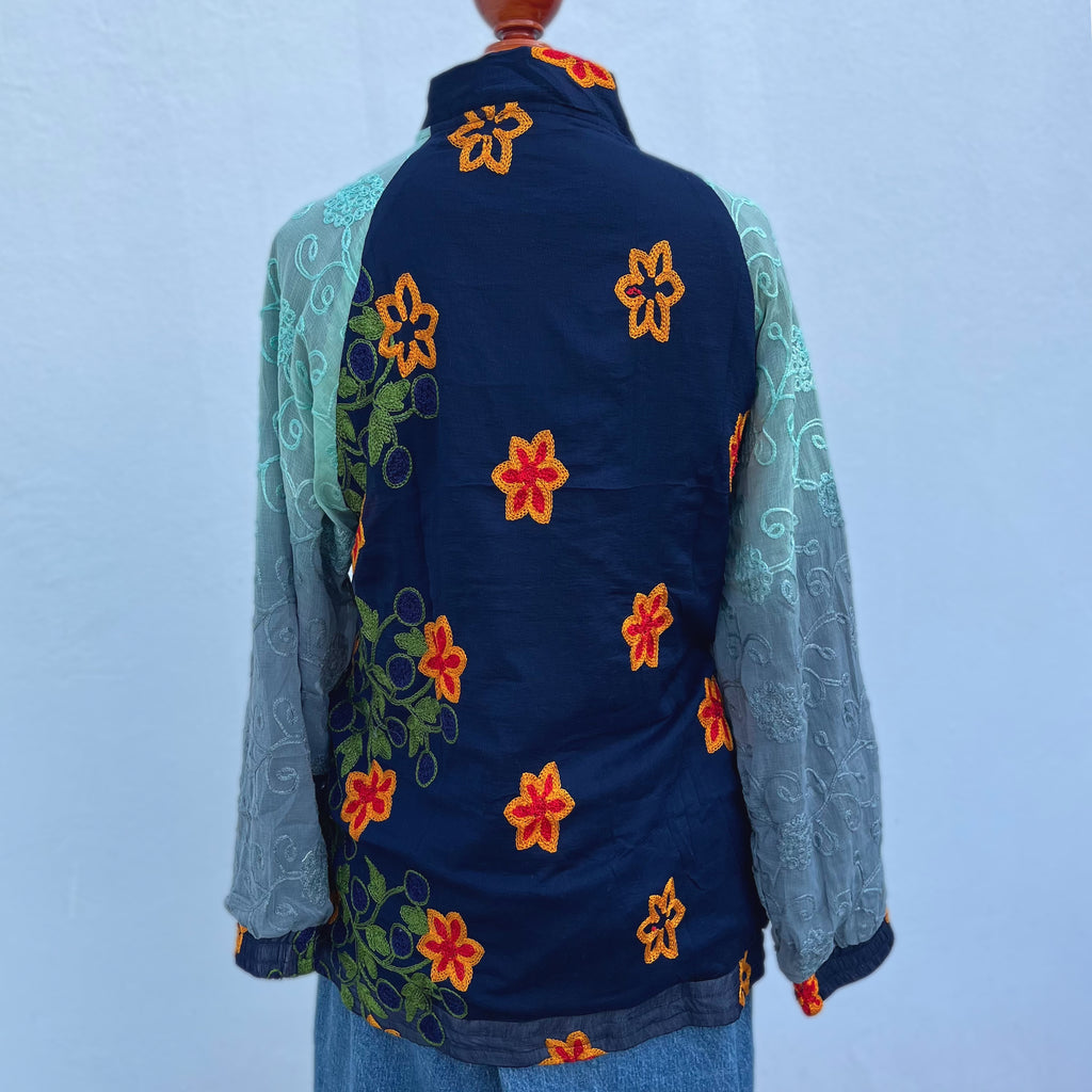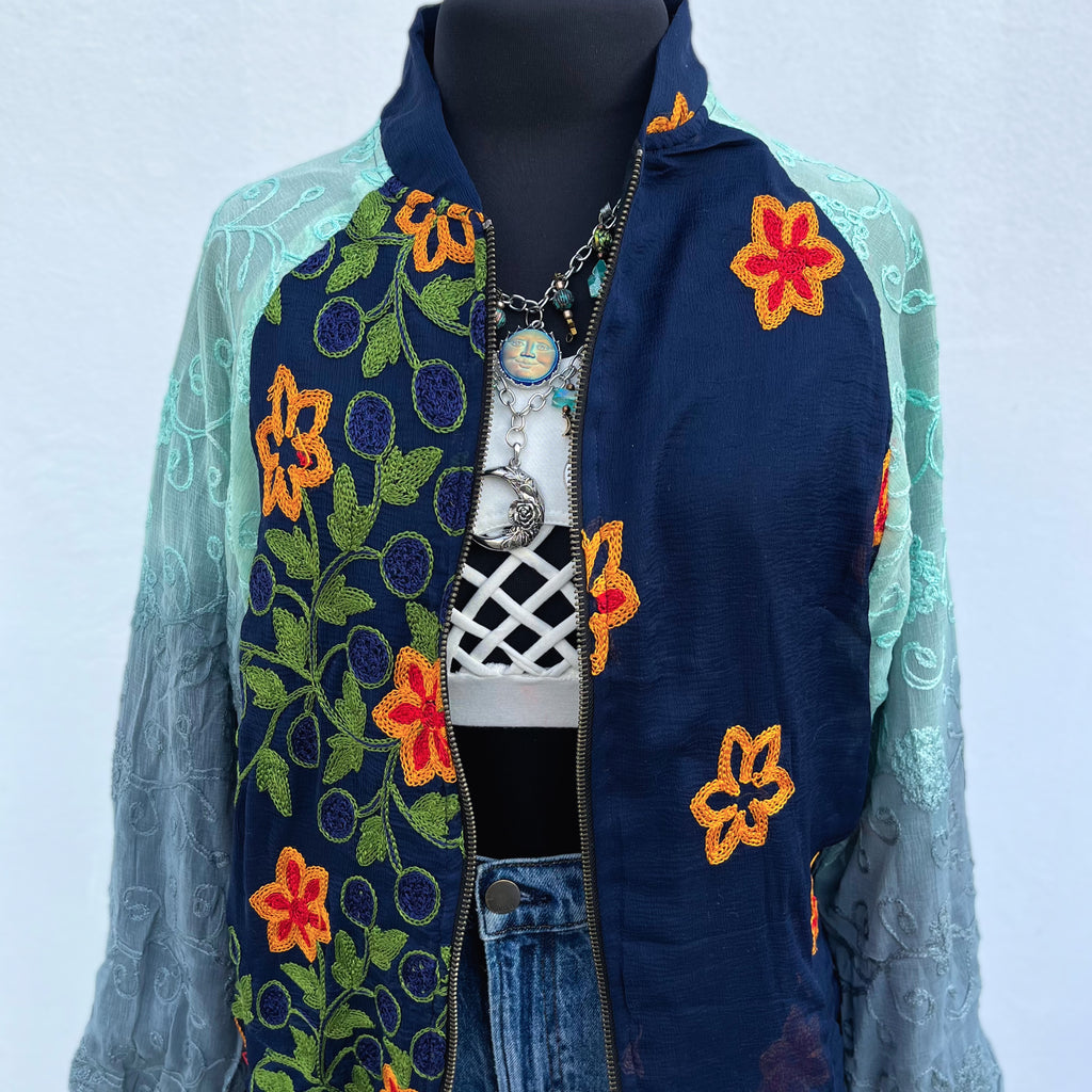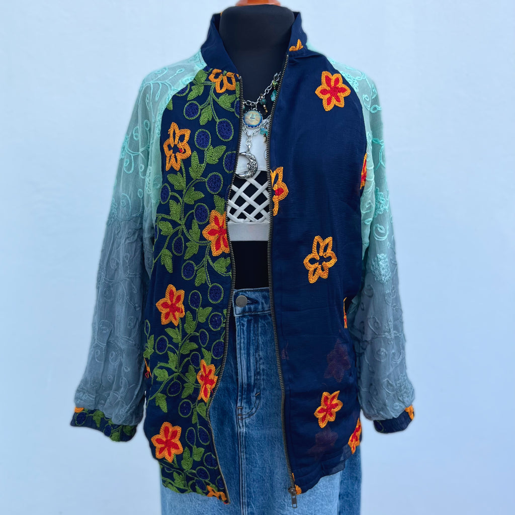 Descripción: Chamarra mágica, estilo bohemio. Está hecha con amor, con telas de dupattas bordadas y tradicionales, propias de comunidades tribales de Asia, en colaboración justa y ética con nosotros.