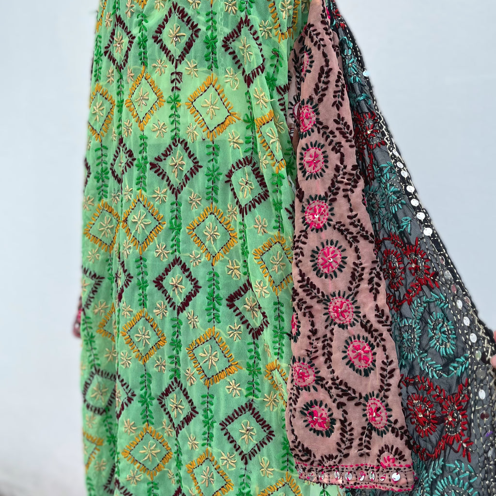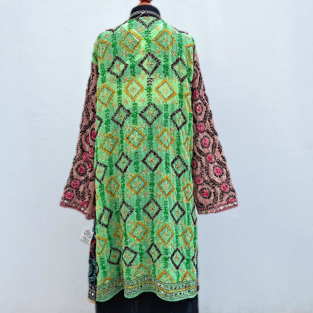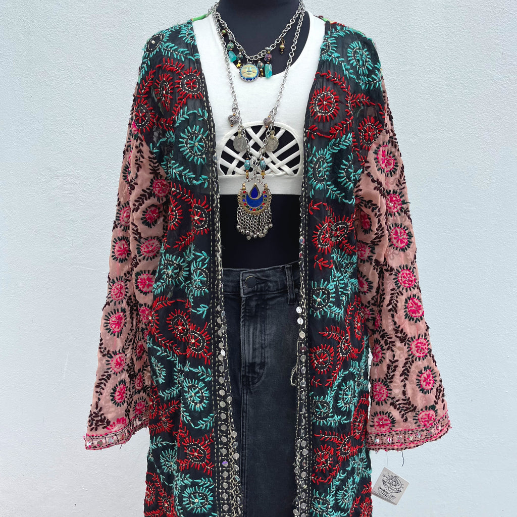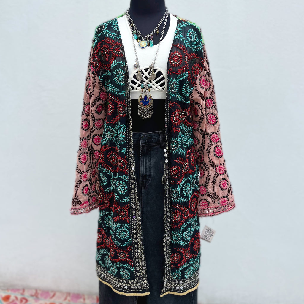Descripción: Kimono mágico, estilo bohemio. Está hecho con amor, con telas de dupattas bordadas y tradicionales, propias de una comunidad tribal del norte de la India, en colaboración justa y ética con nosotros.