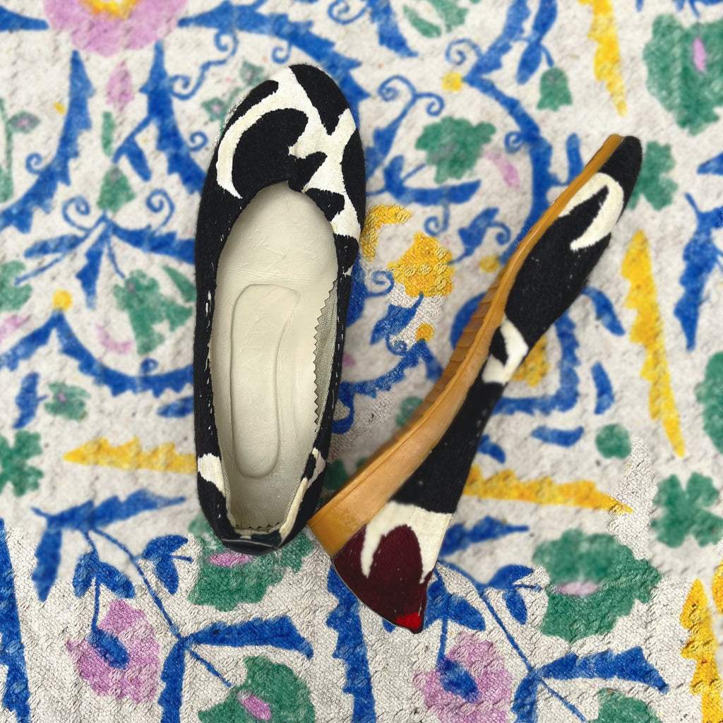 • Materiales: Tela de pana y las otras son de tela de algodón bordado. El talón es de plástico.